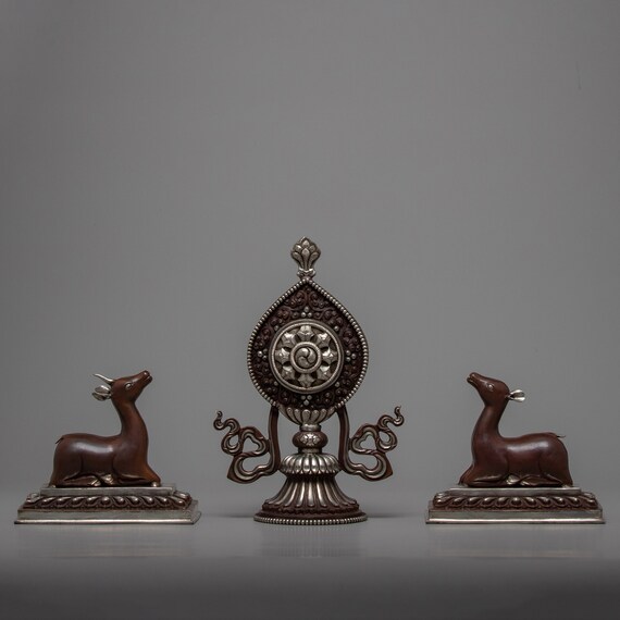 The deer in particular symbolises the realisation of great bliss, while the doe, the realisation of emptiness, and the Dharma Wheel symbolise the union of the two. By progressing in this union, great bliss and emptiness, one attains the five omniscient wisdoms of the Buddha, symbolised by the five-pointed vajra.