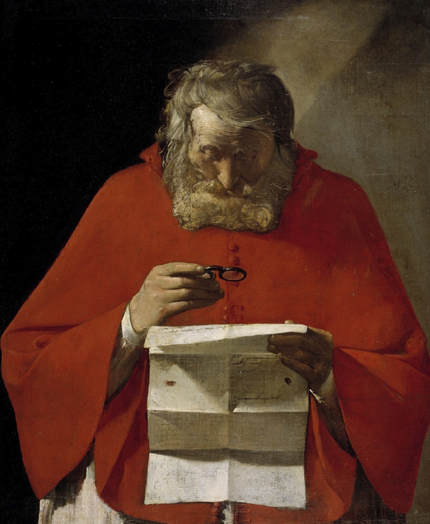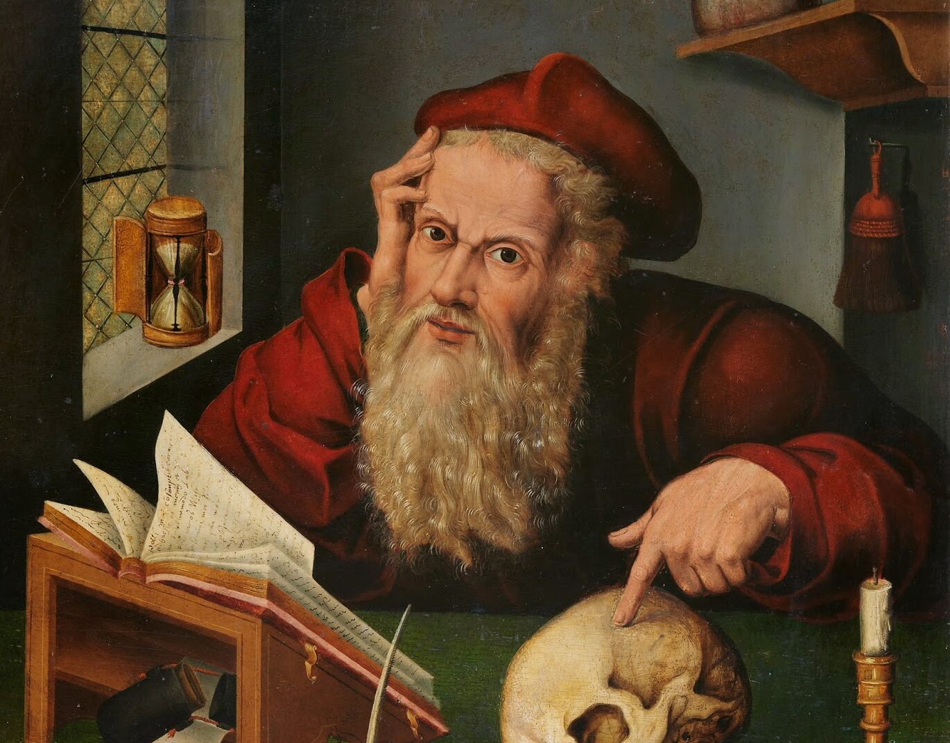 Su iconografía muestra un hombre erudito estudiando y escribiendo. En la pintura también aparece un cráneo como símbolo que la vida es fugaz y se acaba de repente.