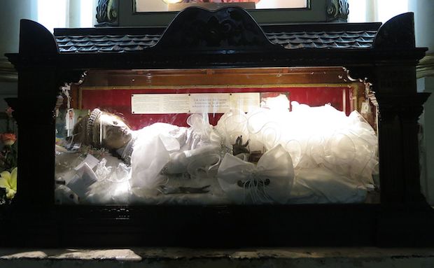 El cadáver de Santa Inocencia ha sido preservado en cera y colocado detrás de un ataúd de vidrio. Ella todavía está vestida con su vestido ceremonial blanco.