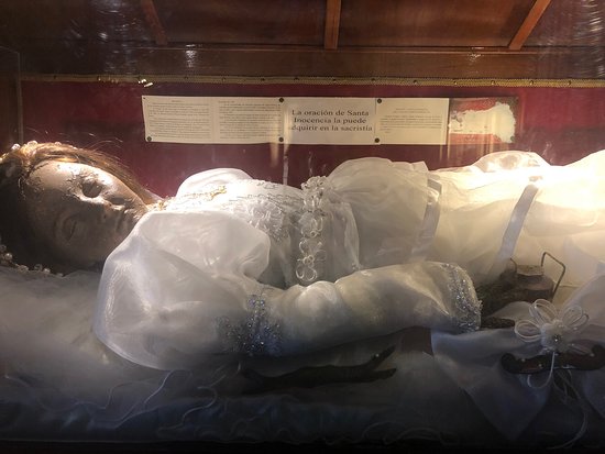 Se encuentra vestida con un traje ceremonial blanco, el cadáver ha sido preservado en cera y colocado en una caja de vidrio. Recientemente, un turista que se encontraba de pie frente al cadáver tomo un escalofriante vídeo, en el cual capto el momento cuando la Santa abre los ojos sorpresivamente.